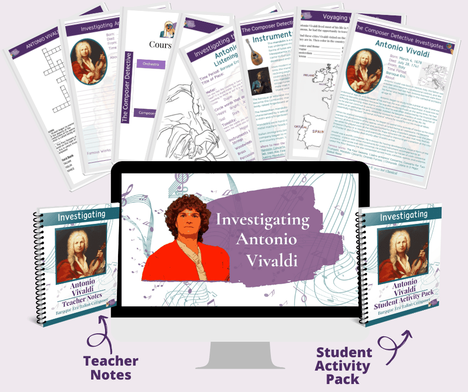 From The Composer Detective: A music appreciation unit study for elementary and middle school students where George Frideric Handel, the German Baroque Era composer, helps your children investigate the life and music of the Italian Baroque Era composer, Antonio Vivaldi.