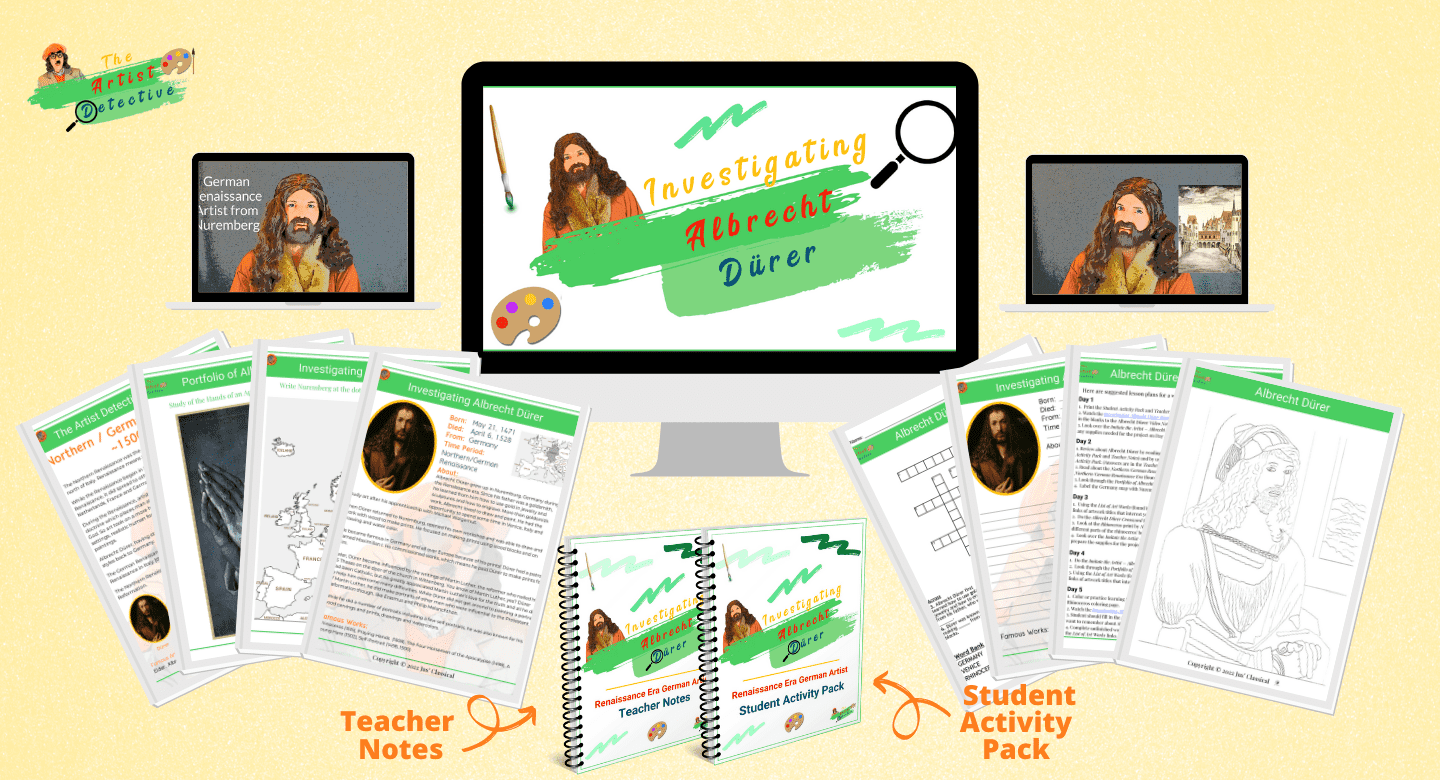 From The Artist Detective: An art appreciation unit study for elementary and middle school students where Rembrandt, the famous Dutch artist, helps your children investigate the life and art of German Renaissance artist, Albrecht Dürer.
