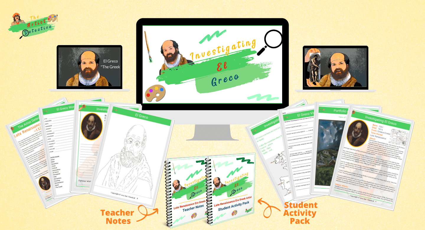 From The Artist Detective: An art appreciation unit study for elementary and middle school students where Rembrandt, the famous Dutch artist, helps your children investigate the life and art of Greek Late Renaissance artist, El Greco.